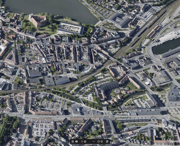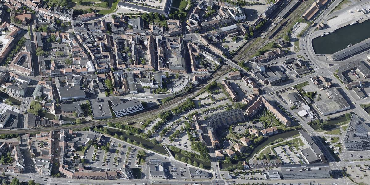 Grunden er det store p-plads område i midten af billedet. Til højre ses campusområdet, og nord for gågaden og Koldinghus. Foto: Kolding Kommune